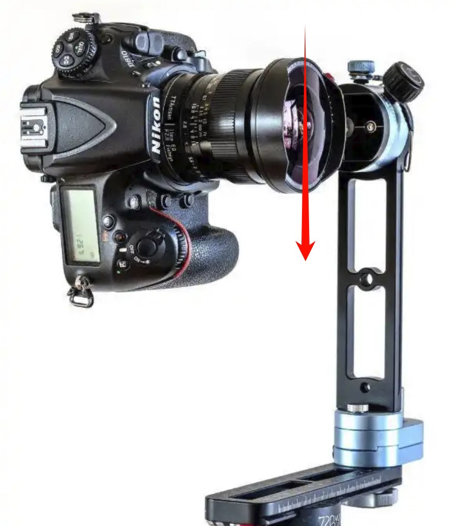 在我们进行淮安VR全景拍摄的过程中,除了部分要求不高的使用VR全景相机外,淮安专业的都是用专业相机,我们在使用专业相机的时候,必不可少的就是VR云台,在长时期用过VR云台的人我想都会遇到一个相当无语的问题:拍摄过程中会出现相像镜头向正下文下垂,如下图箭头方向下垂。